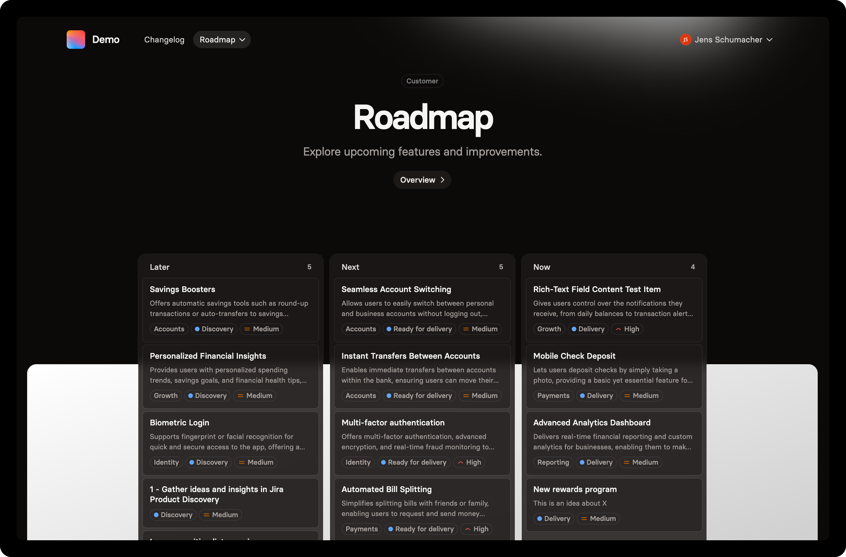 For most roadmap communication, the Board view is ideal — it shifts the focus from specific dates to broader goals, priorities, or any structure you define.